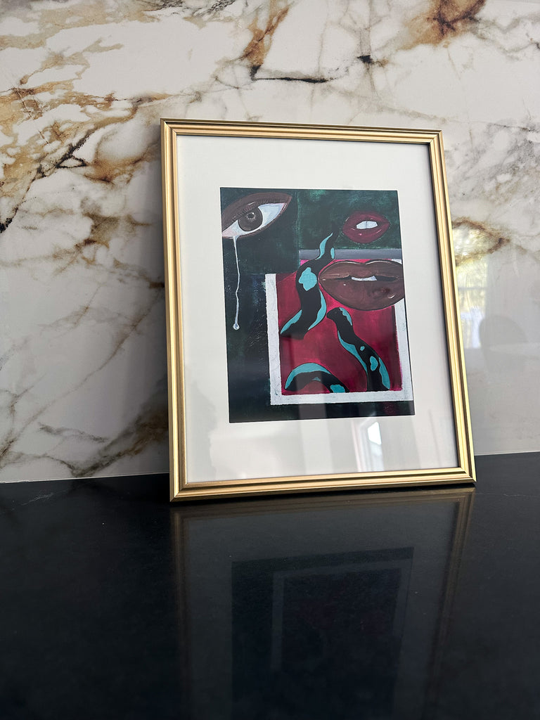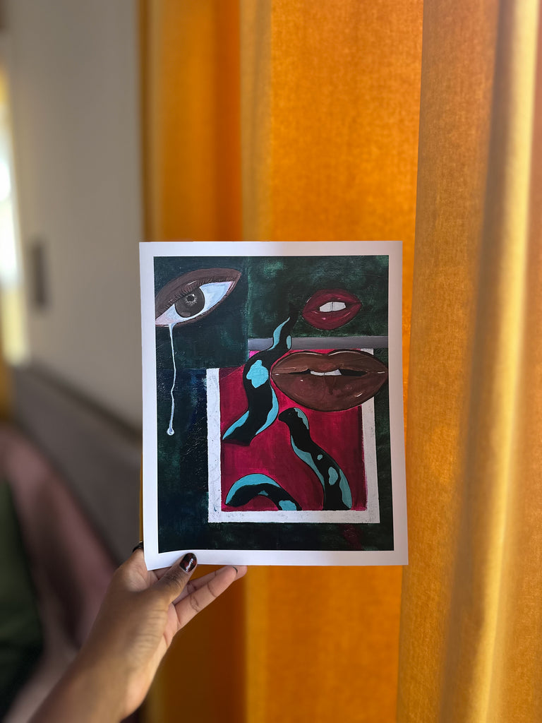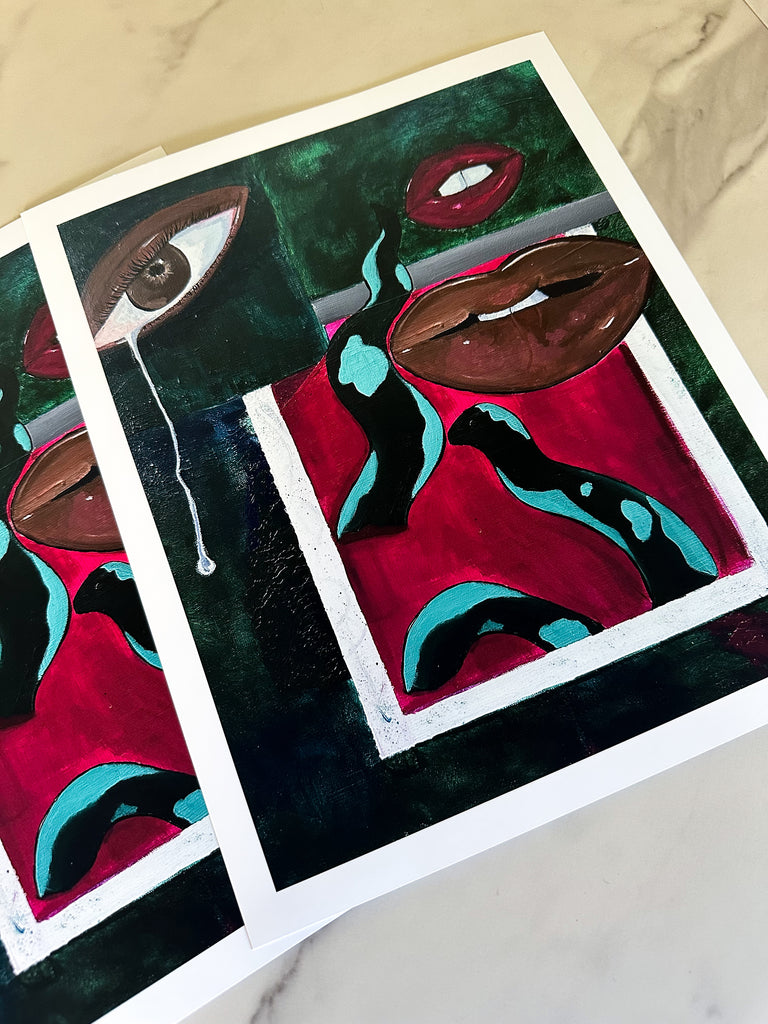 This unframed 8x10 art print is a reproduction of the Soft Reclamations Acrylic on Canvas original artwork. Soft Reclamations follows the new beginnings of the artist. The tearful eye signifies happiness about entering a new era of life. The lips express the artist's need to be vulnerable and outspoken - no longer mincing words. The snake weaves the rest of the story together, reflecting the themes of starting over and transformation.